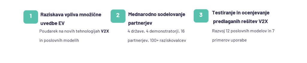 - Za rešitve, ki se bodo izkazale kot uspešne in izvedljive bodo razviti novi poslovi modeli, ki spodbujajo množično sprejemanje storitev V2X in omogočajo integracijo EV v elektroenergetska omrežja in trg električne energije.